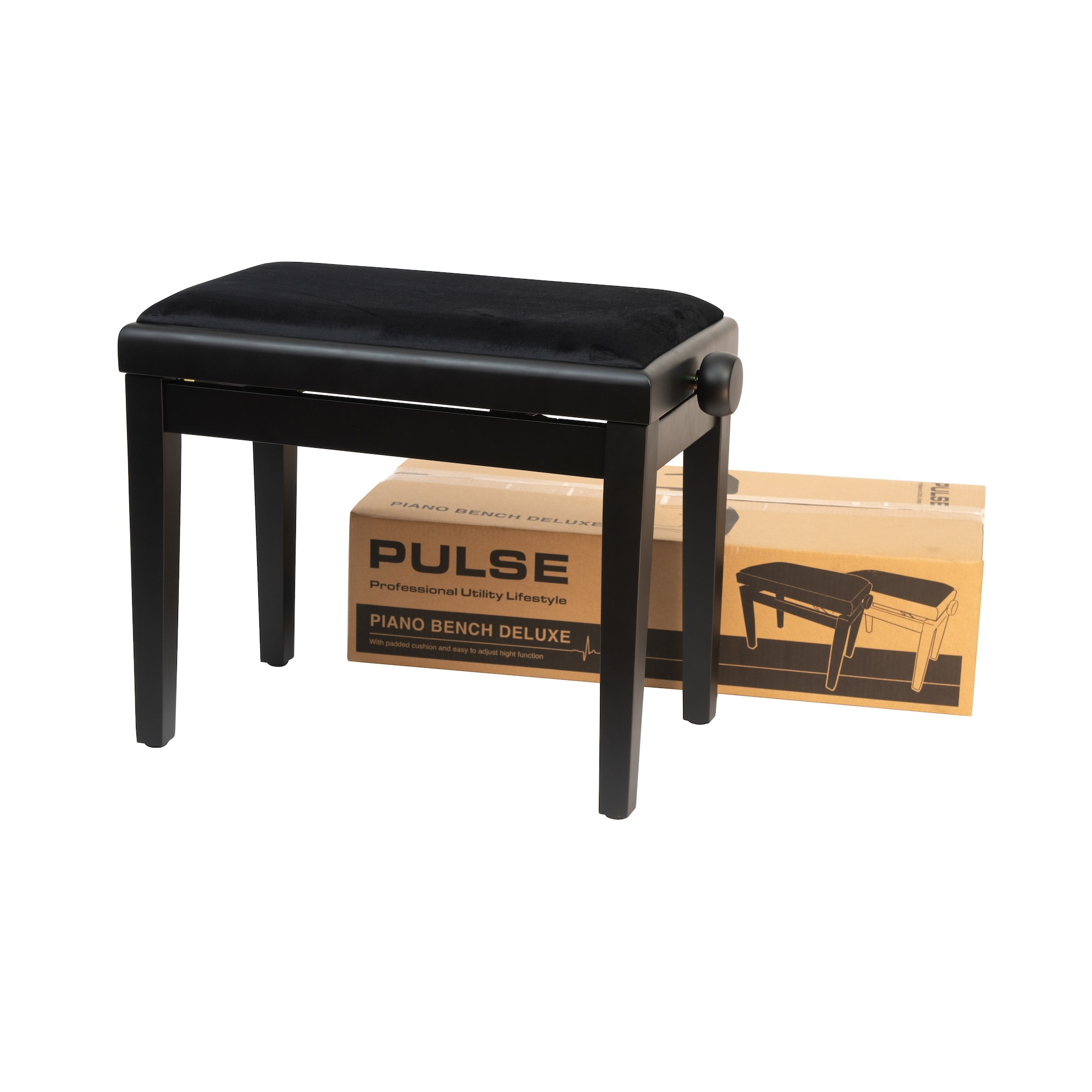 Pianopall med solid och hållbar konstruktion. Mjuk och bekväm stoppad sittdyna med tyg, enkelt höj/sänkbar med skruvrattar.